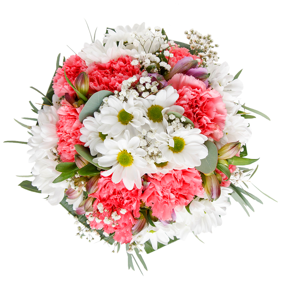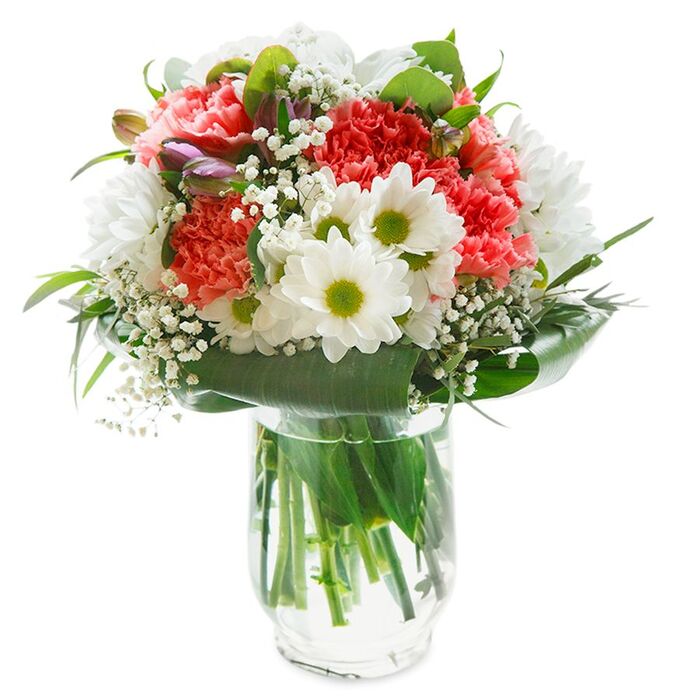 Send elegance with our graceful and unique mixed flower bouquet. This stunning arrangement combines snow-white chrysanthemums, fluffy gypsophila, and soft pink carnations, artfully arranged with vibrant aspidistra leaves.